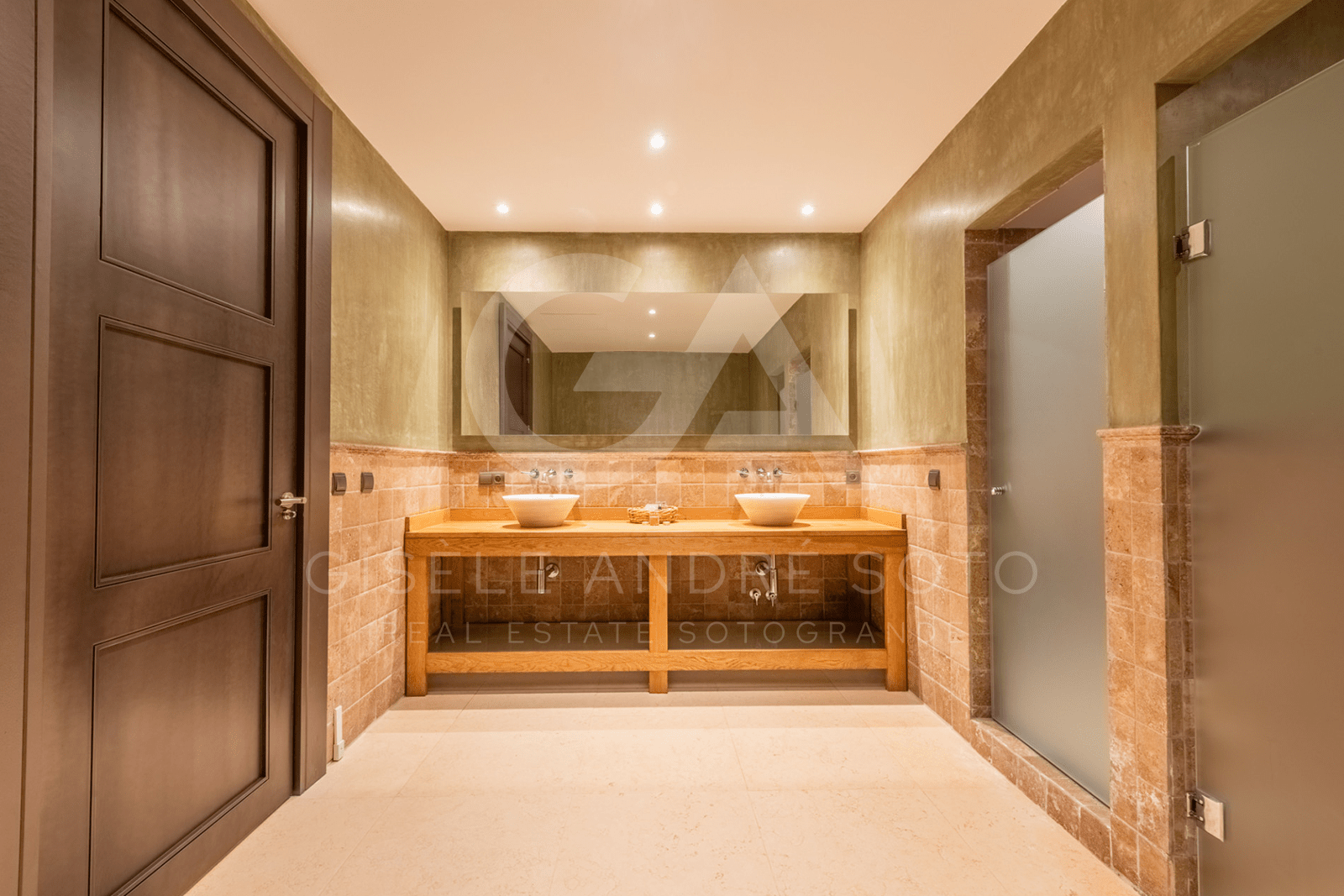 The Almenara Golf Villa welcomes you with a grand entrance hall leading to an en-suite bedroom, a state-of-the-art ultra-modern kitchen, and a spacious living/dining area that seamlessly connects to a large covered terrace with steps descending to a pristine saltwater swimming pool and lush garden. A study/TV room with its own terrace adds versatility. On the first floor, a stunning "Minstrel" gallery leads to the master suite with a dressing room, a guest suite with a private terrace, and two additional double bedrooms sharing a bathroom. The semi-basement features a bathroom, a bodega, a gym, and a games room, all finished with aged marble floors.