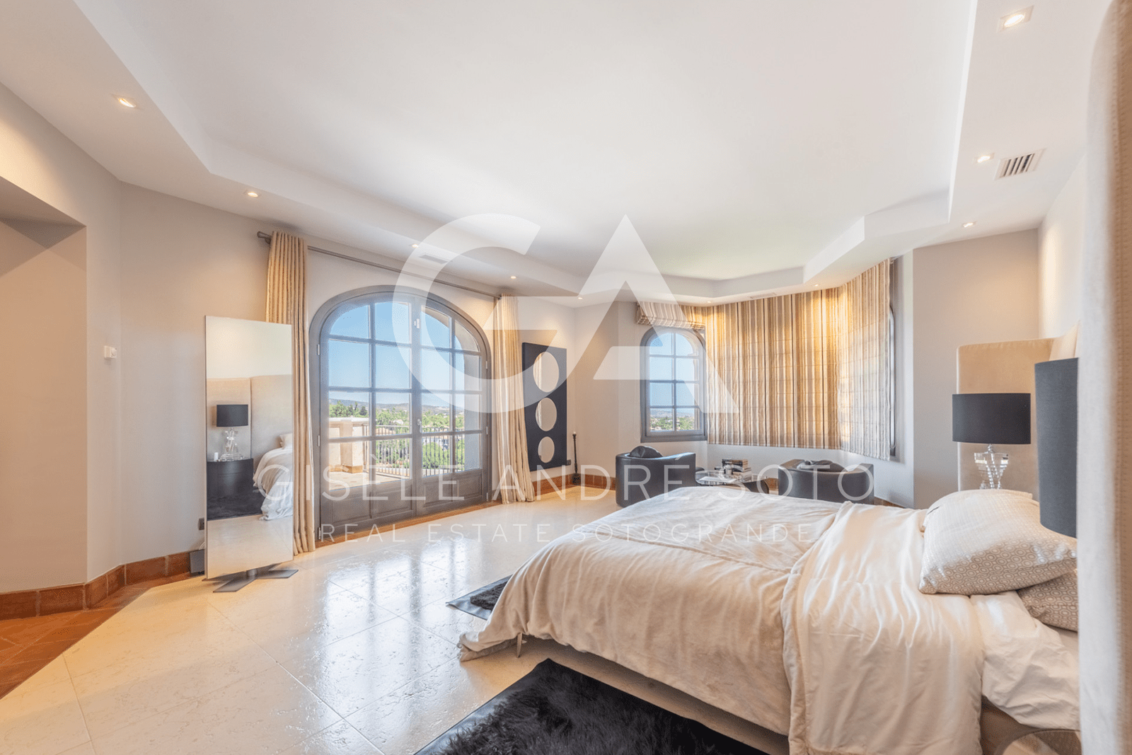 Experience unparalleled luxury in this superb Almenara Golf Villa, perched on an elevated site with breathtaking panoramic views over the Almenara Golf Course, majestic mountains, and the sparkling sea. Meticulously crafted to the highest standards, this residence boasts whitened oak carpentry, aged marble flooring throughout, hardwood double-glazed windows, underfloor heating on the ground and first floors, and air conditioning throughout for year-round comfort.