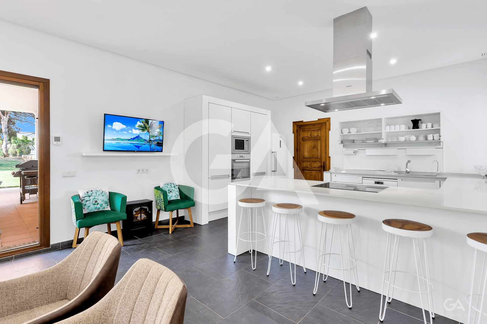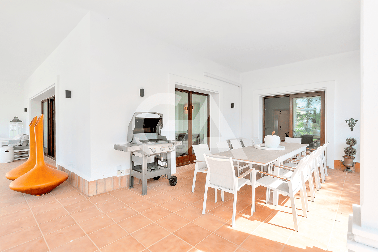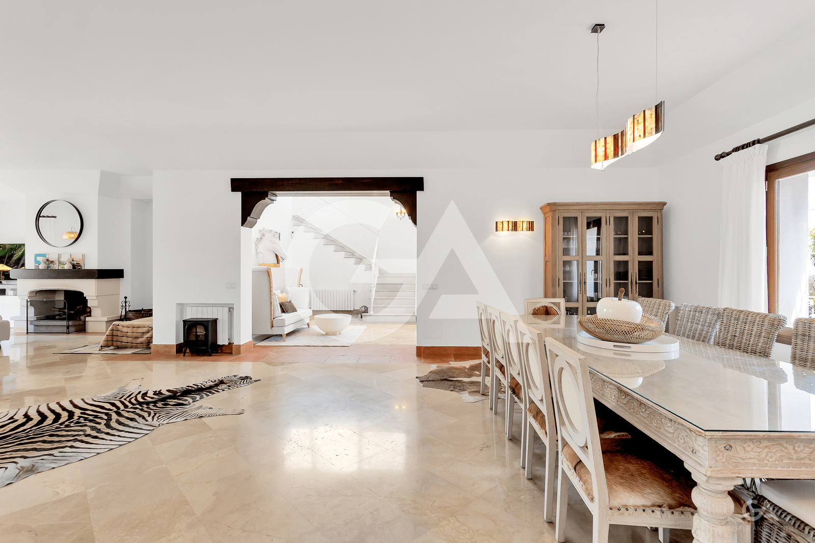 Crafted for Mediterranean living, this luxury villa in Sotogrande offers a fully equipped kitchen with modern appliances and an informal dining area, connected to a practical laundry room and garage for easy access. The covered terrace features a 12-seater dining table and barbecue area, ideal for al fresco Spanish-style lunches, while sun loungers by the private pool invite relaxation under the summer shade. Additional amenities include a comfortable sofa area on the terrace for evening gatherings, ensuring this luxury villa in Sotogrande is perfect for entertaining and family living. The villa’s proximity to the Almenara Golf Course and SO/ Sotogrande Hotel adds a layer of exclusivity to its appeal.