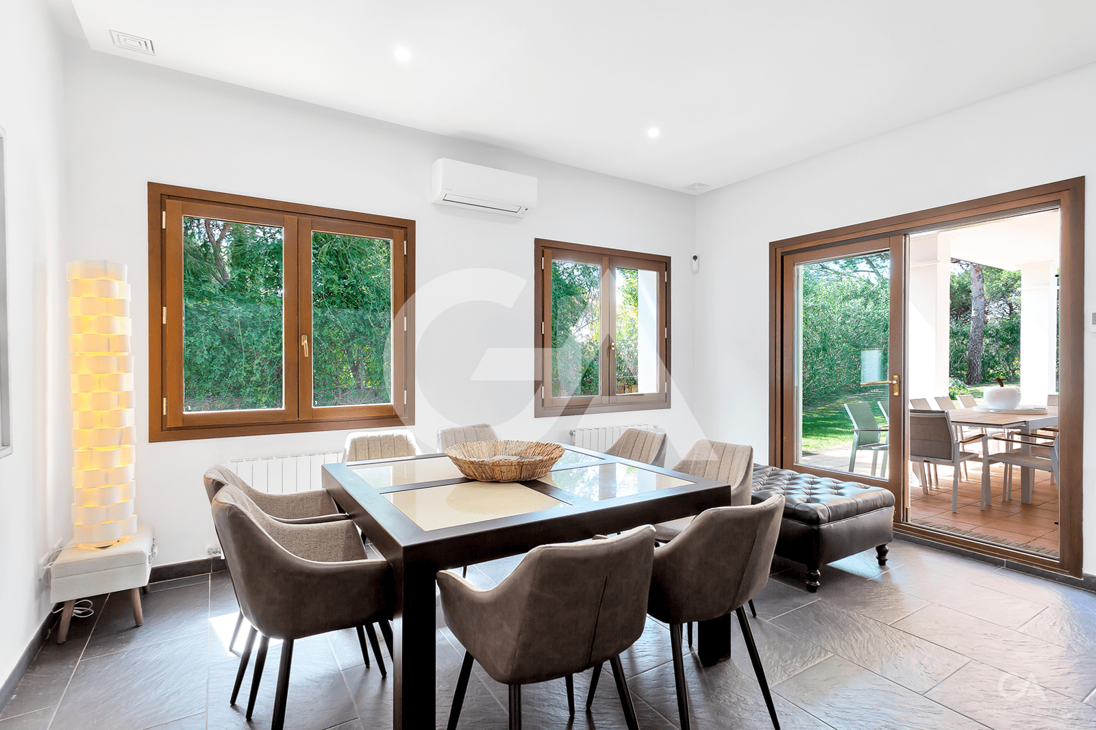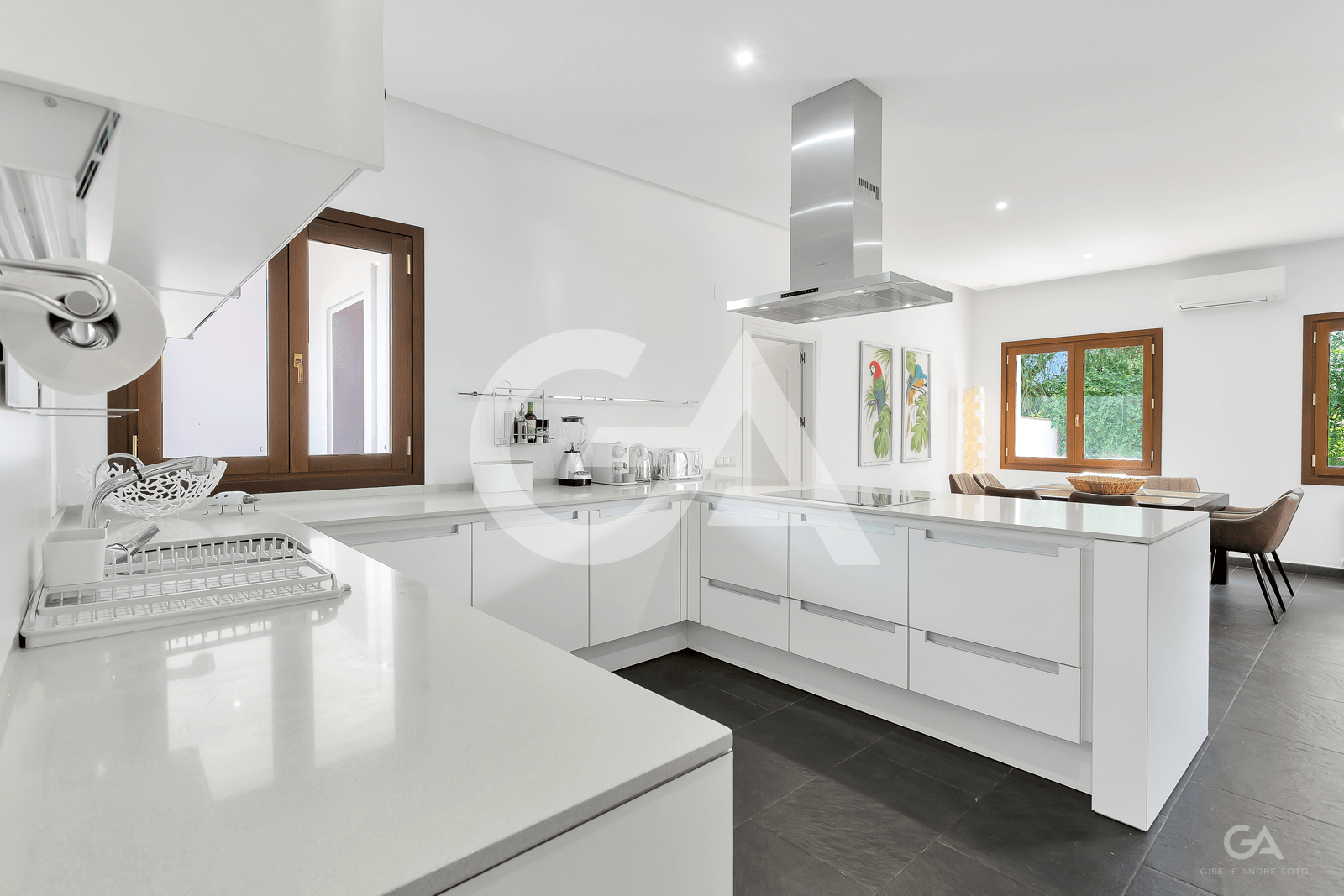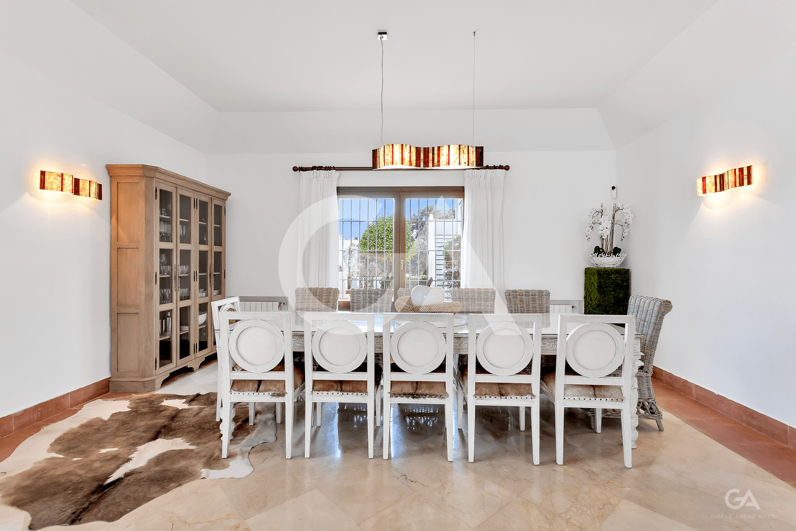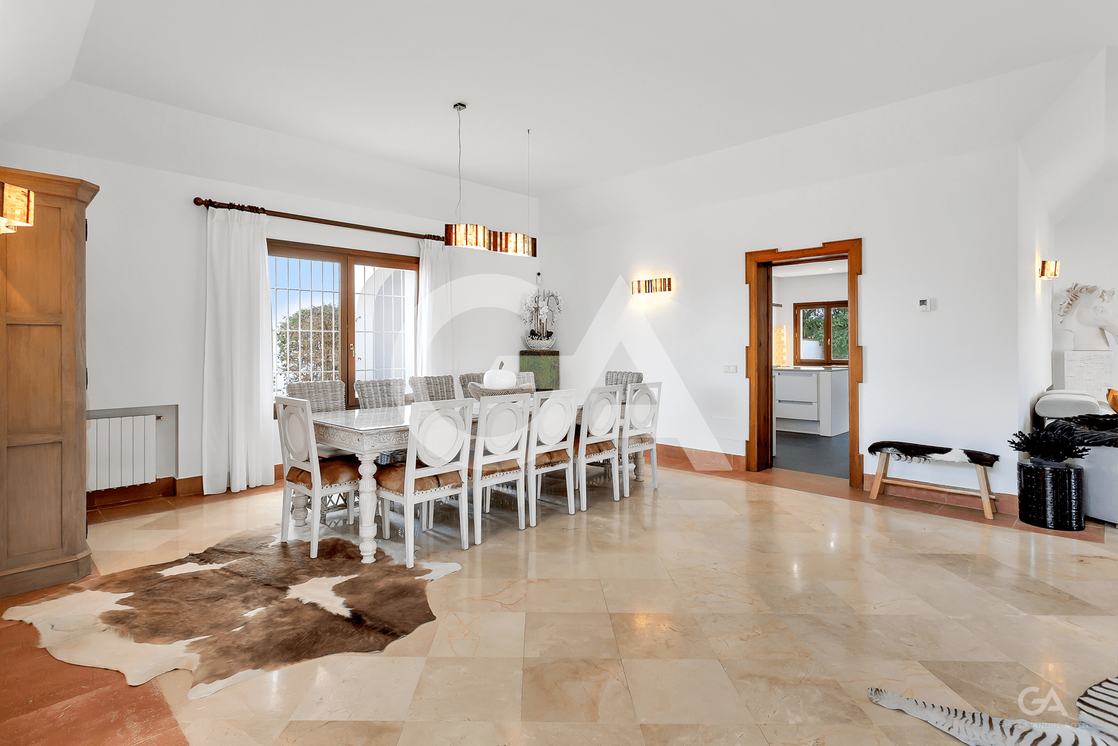 Crafted for Mediterranean living, this luxury villa in Sotogrande offers a fully equipped kitchen with modern appliances and an informal dining area, connected to a practical laundry room and garage for easy access. The covered terrace features a 12-seater dining table and barbecue area, ideal for al fresco Spanish-style lunches, while sun loungers by the private pool invite relaxation under the summer shade. Additional amenities include a comfortable sofa area on the terrace for evening gatherings, ensuring this luxury villa in Sotogrande is perfect for entertaining and family living. The villa’s proximity to the Almenara Golf Course and SO/ Sotogrande Hotel adds a layer of exclusivity to its appeal.