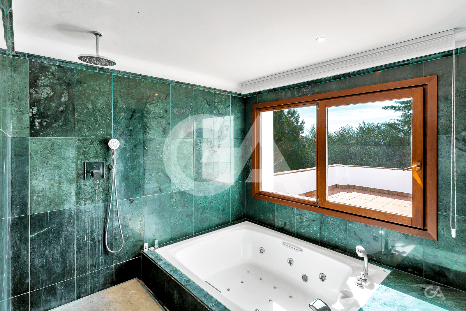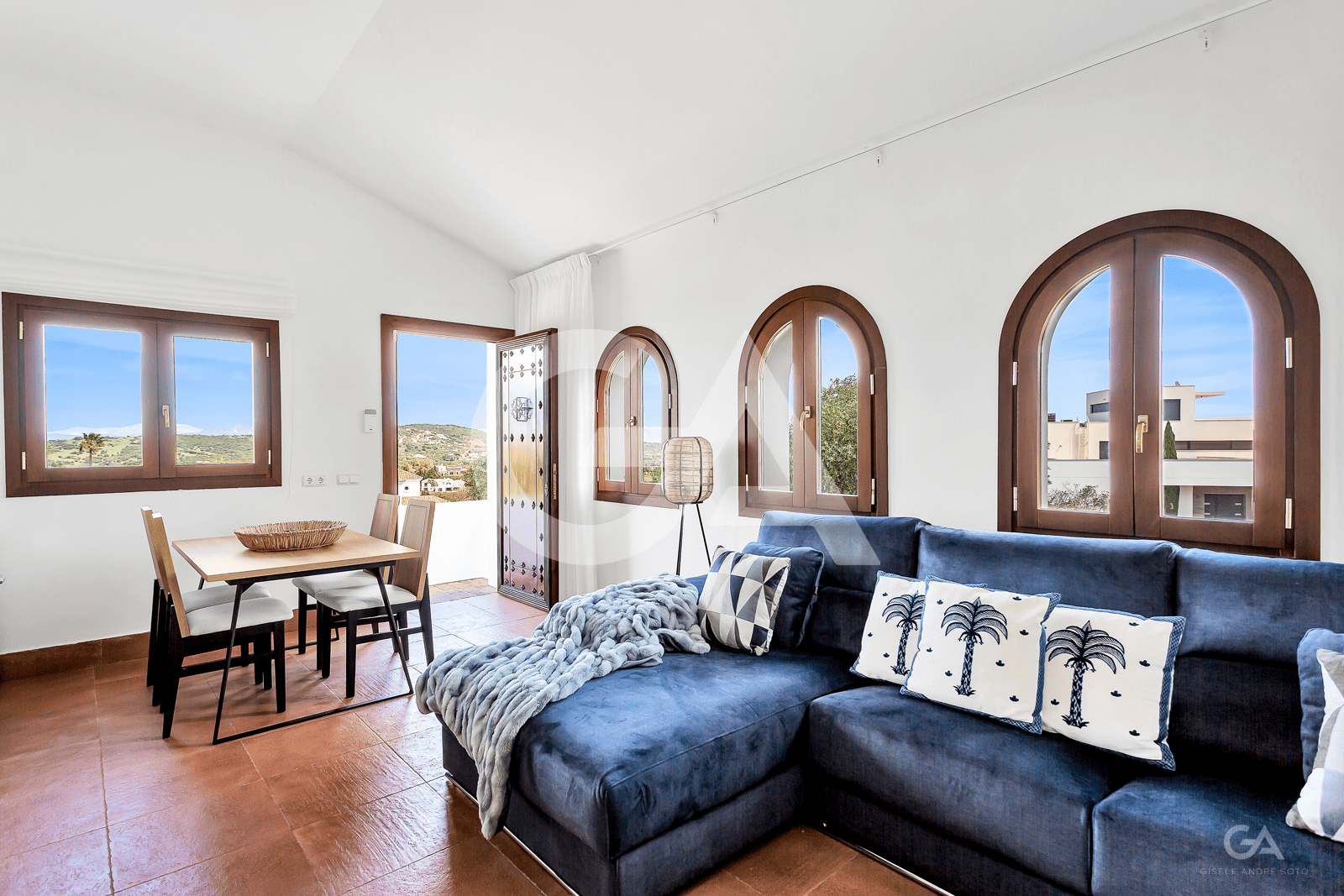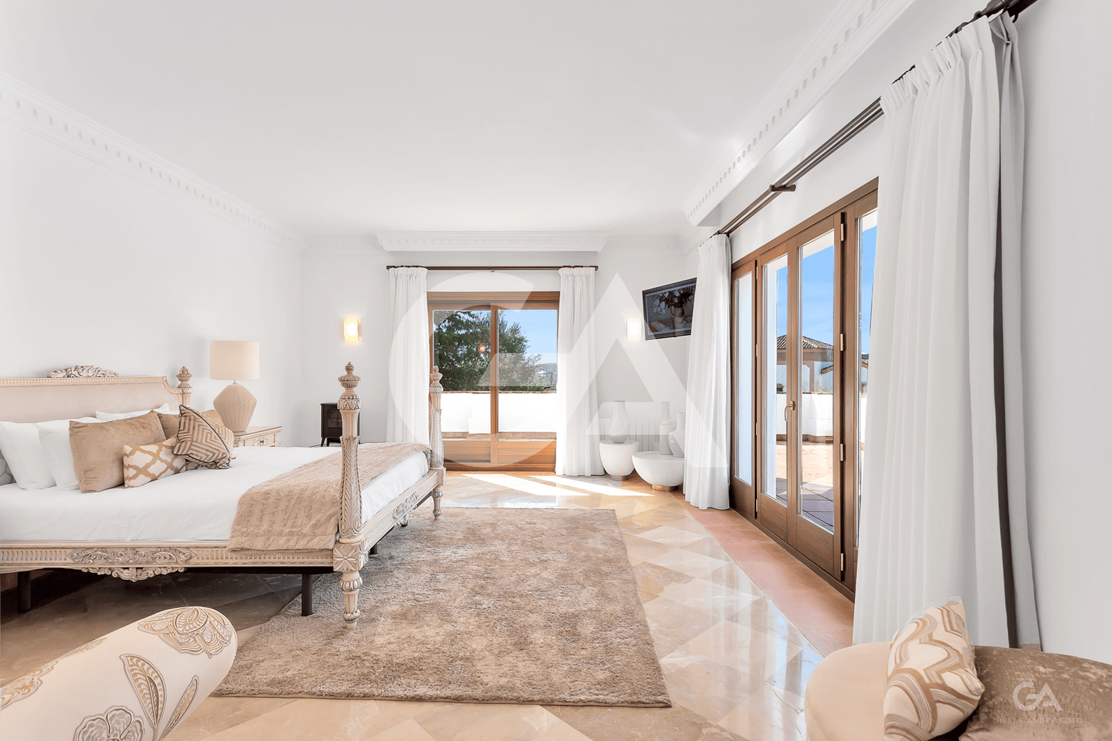This luxury villa in Sotogrande is thoughtfully designed to harmonise indoor and outdoor living. The ground floor features three large en-suite bedrooms, each offering ample space and natural light, ideal for family or guests. The first floor is dedicated to the luxurious master bedroom, complete with a spacious en-suite bathroom and glass fold-away doors opening onto a private balcony with panoramic mountain views. A spiral staircase leads to a second-floor private balcony, perfect for enjoying the serene surroundings. Above the garage, an independent guest studio with one bedroom, en-suite bathroom, and living room provides a private retreat for visitors, enhancing the versatility of this luxury villa in Sotogrande.