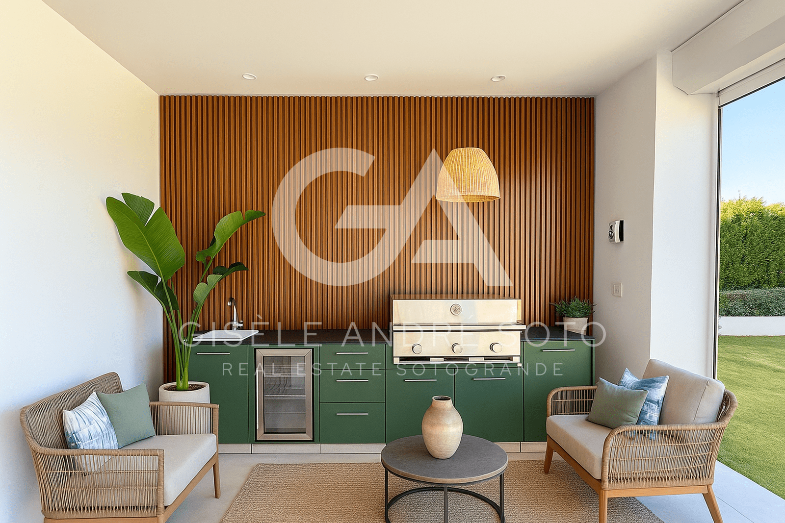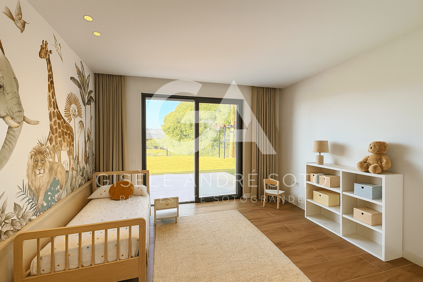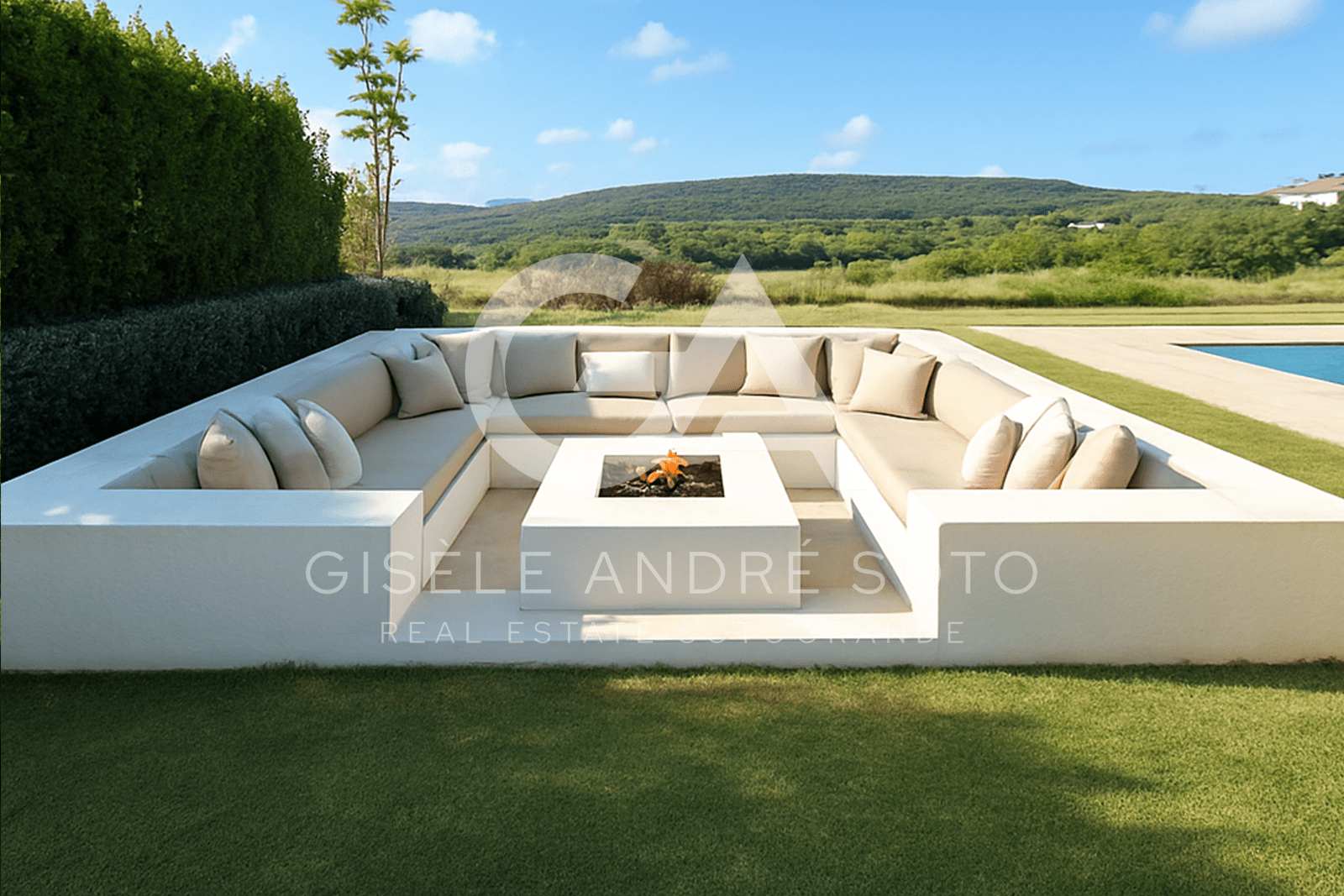 The exterior is a haven for relaxation and entertainment, featuring a private swimming pool, a fire pit for cozy evenings, and a premium putting green, all framed by beautifully maintained gardens that border the golf course. The property is equipped with an advanced security system, including discreetly integrated surveillance, motion sensors, and smart access controls, ensuring total peace of mind. Additional features include air conditioning (hot and cold), underfloor heating, cable satellite TV, high-speed WiFi, and double-glazed windows for enhanced energy efficiency (rated Class B). The villa is part of a secure, gated community with 24-hour security, with community fees of €202/month, an IBI (property tax) of €3,014/year, and a garbage tax of €380/year.