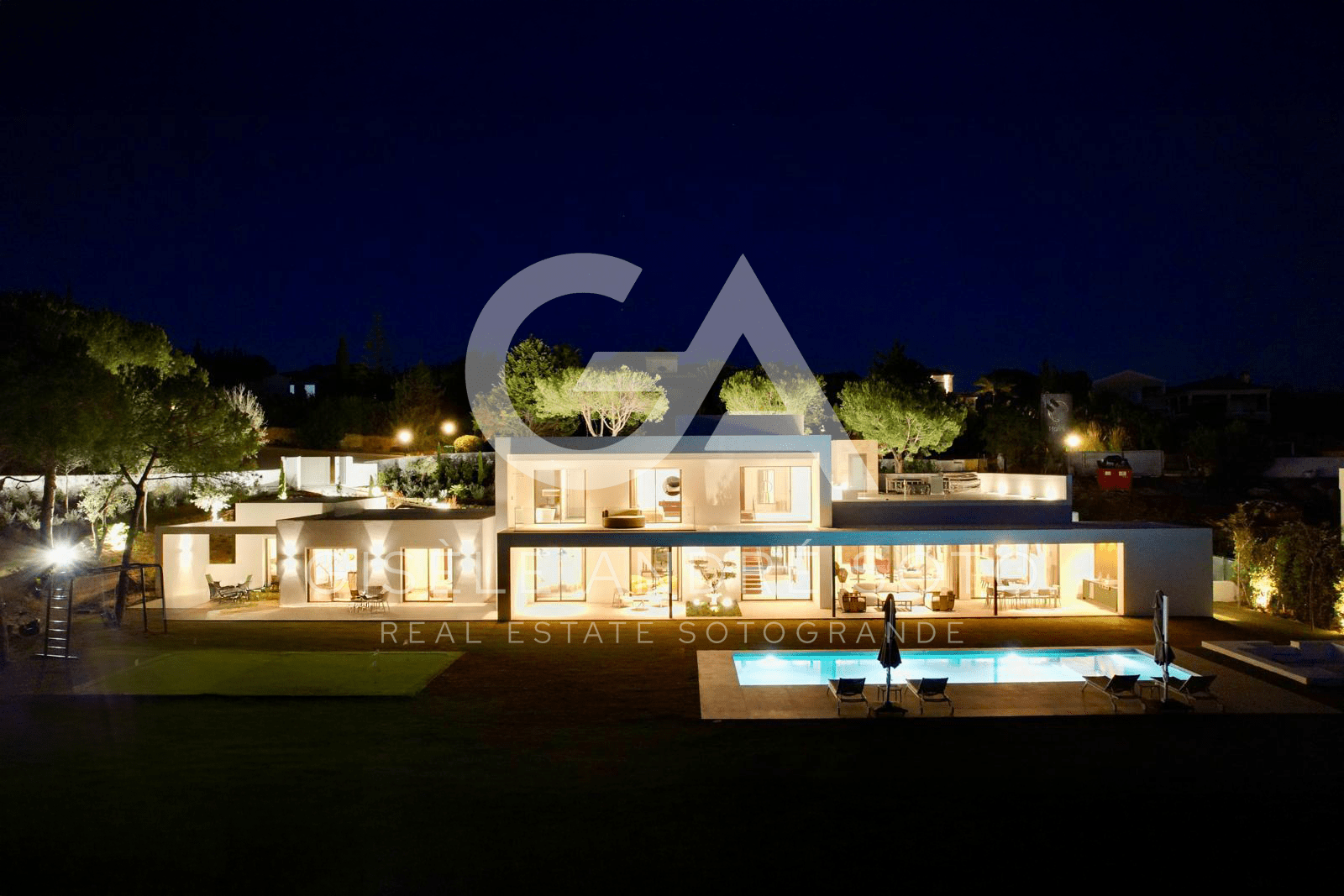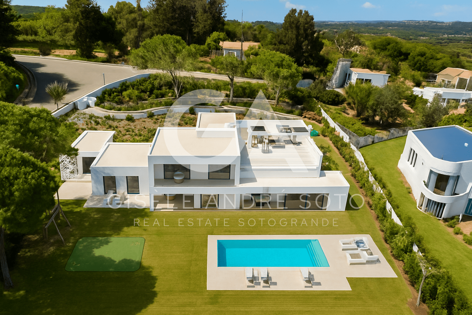 Nestled in the exclusive enclave of Sotogrande Alto, this stunning contemporary villa commands a prime frontline golf position with breathtaking panoramic views across a serene lake and distant glimpses of the Mediterranean Sea. Spanning an impressive 1,070 m² of built space on a generous 4,802 m² plot, this meticulously designed residence blends modern elegance with unparalleled comfort, offering an exceptional lifestyle opportunity in one of Sotogrande’s most coveted locations. With a southwest orientation, the villa is bathed in natural light, enhancing its sleek architectural lines and luxurious finishes.