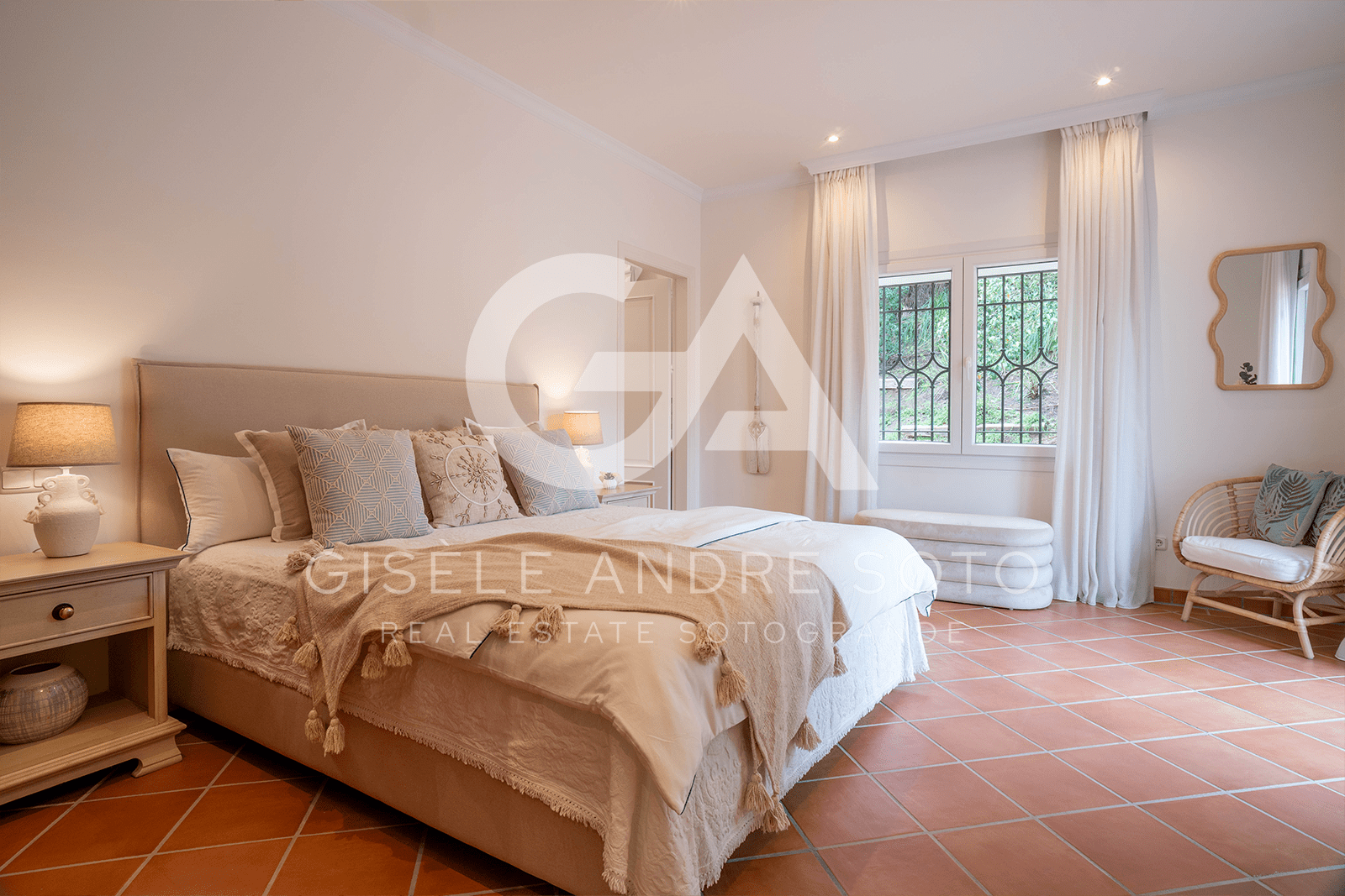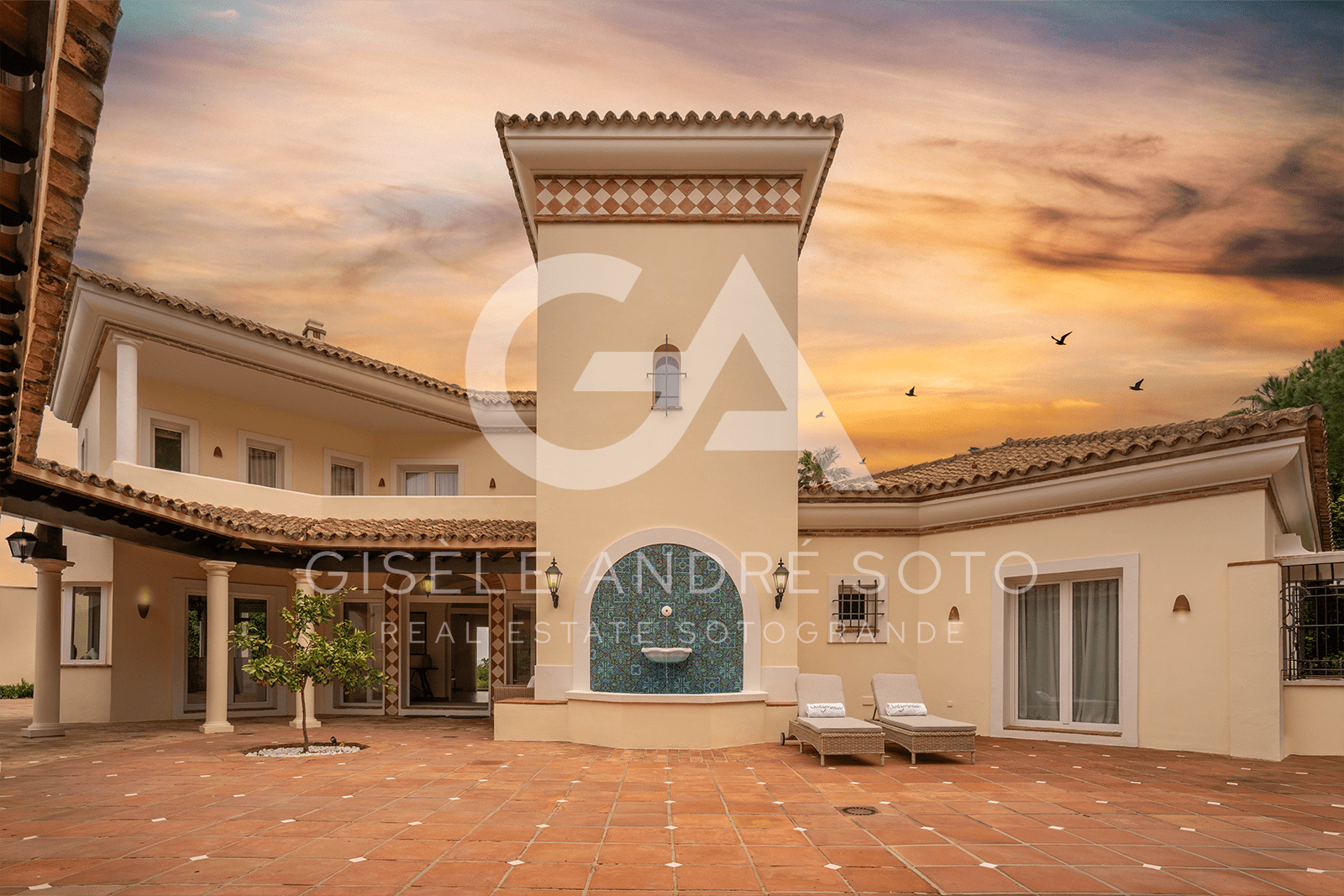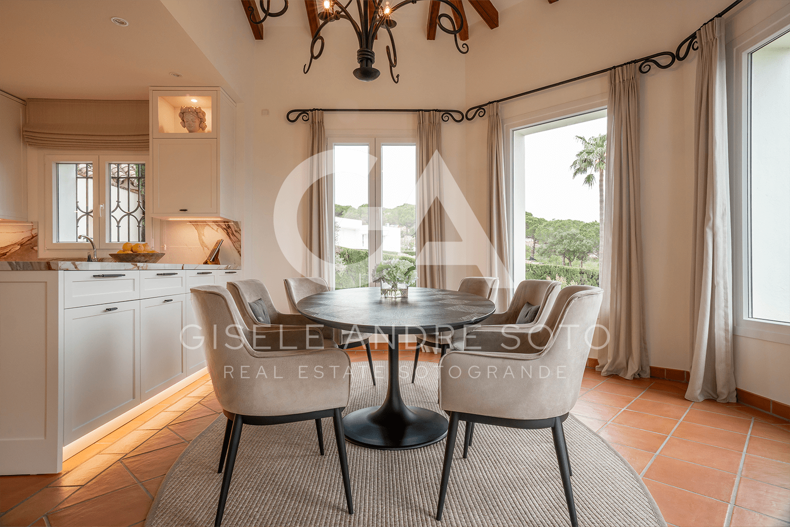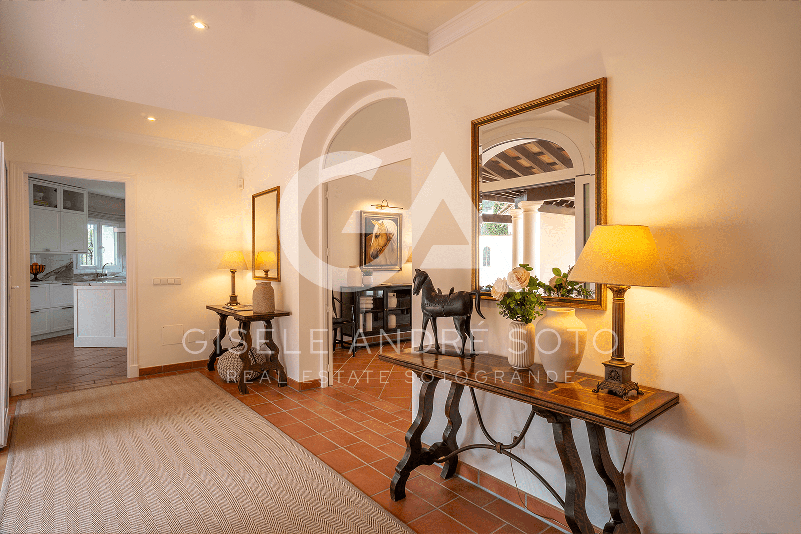 - Style: Traditional Spanish/Mediterranean with beamed ceilings and terracotta-style flooring