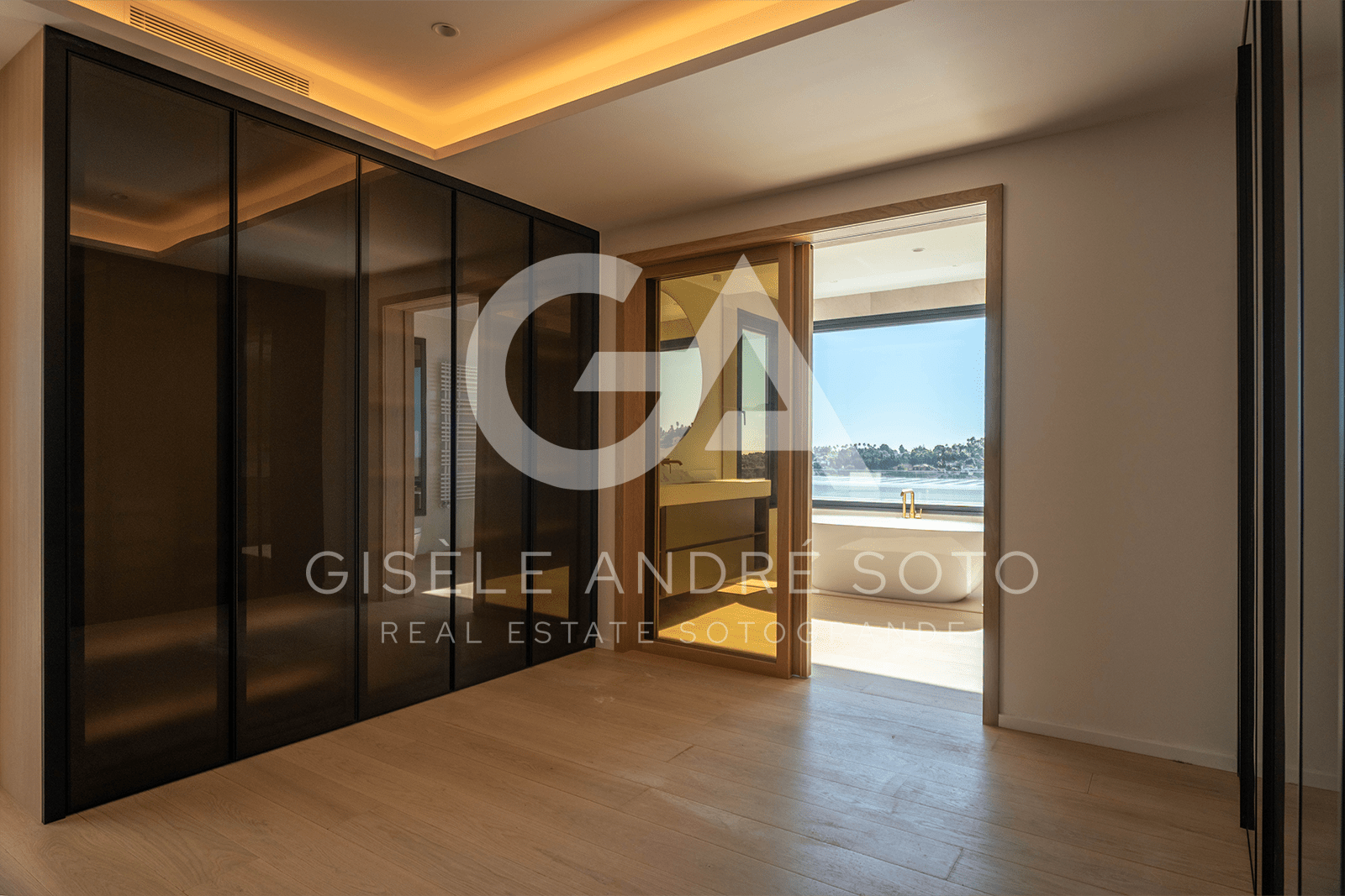Sliding doors provide seamless access to expansive terraces, with the main terrace running along the lounge and kitchen, overlooking the 20-meter heated infinity saltwater swimming pool and beautifully landscaped gardens. High-end finishes include custom built-in wardrobes and cabinetry by Moncada.