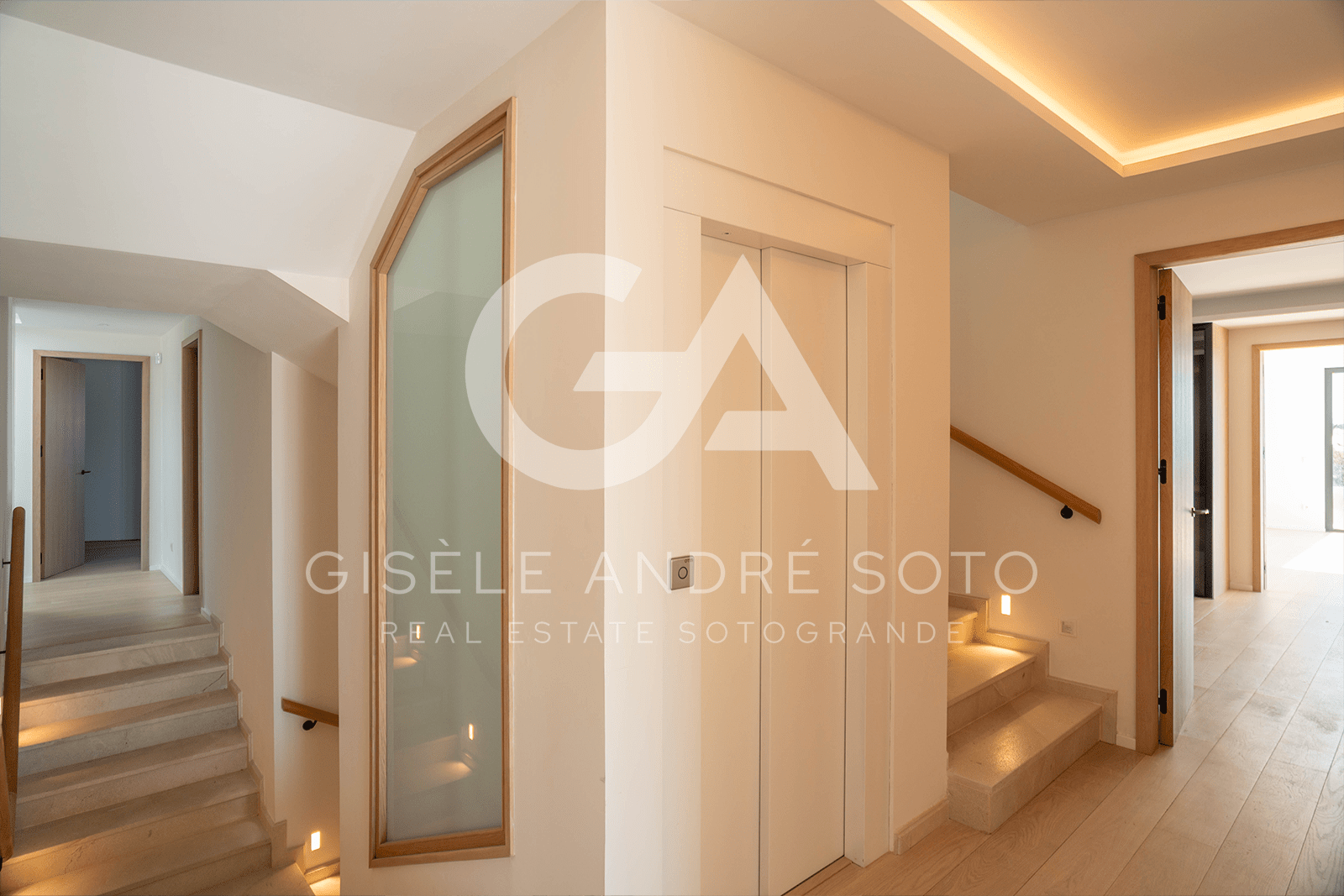 The ground floor features a spacious entrance hall leading to an elegant living room with a fireplace and an outdoor water feature. Enjoy ocean and golf views from the modern, fully fitted state-of-the-art dining area and equipped kitchen. Additional conveniences include a separate laundry room, utility room, fitted storage cabinets with a built-in wine cooler, guest toilet, and a family/TV room. A discreet elevator serves all three floors.