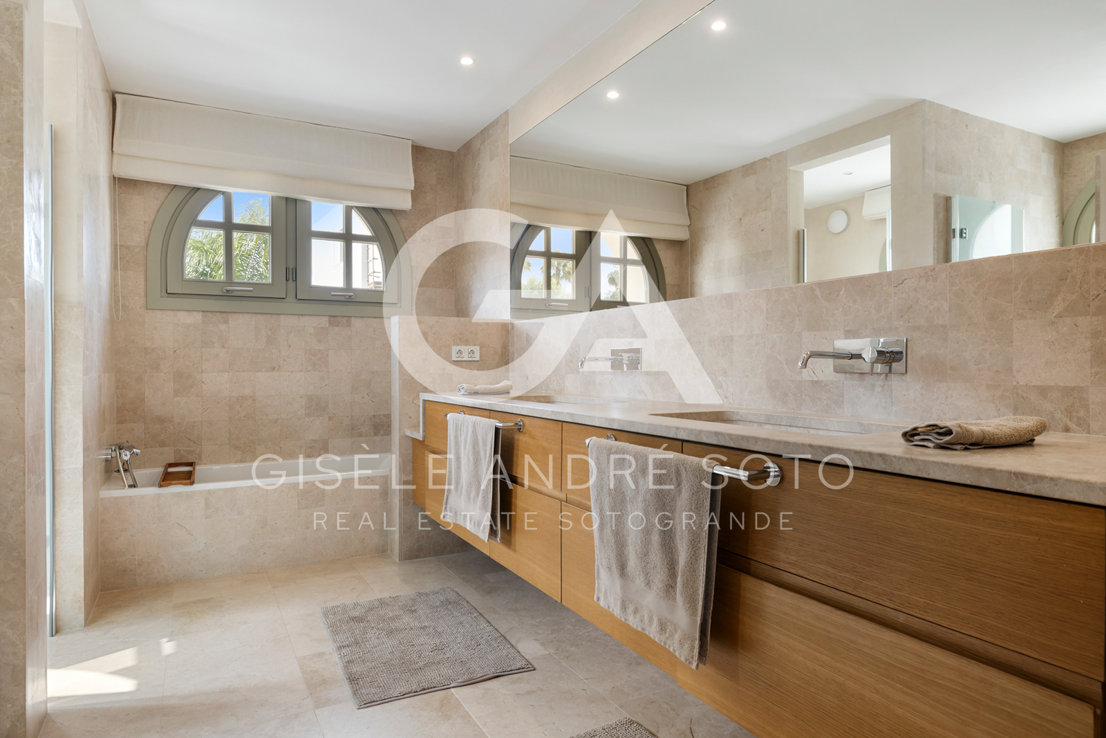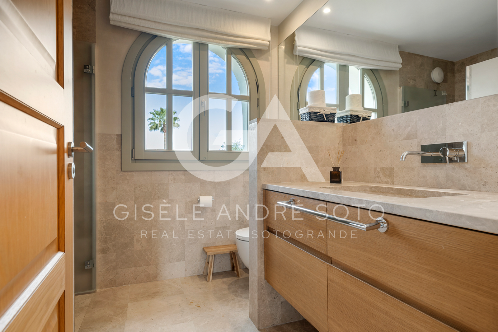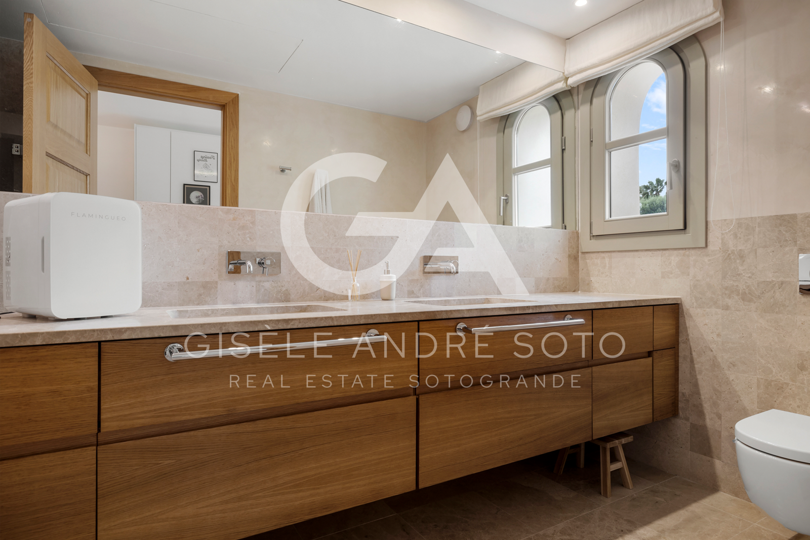 Ascending to the upper floor, the vast master suite of the villa in Zone F Sotogrande serves as a private sanctuary, complete with a terrace showcasing mesmerising views, an opulent en-suite bathroom, and a bespoke dressing room. Two additional bedrooms, each with en-suite bathrooms and private terraces, offer versatile spaces currently used as a guest room and a sophisticated office. Enhanced by underfloor heating, individually controlled air conditioning, and distinctive window architecture with graceful round arches, every room in the villa in Zone F Sotogrande is a gallery of distant horizons, tailored for family comfort and elegance.