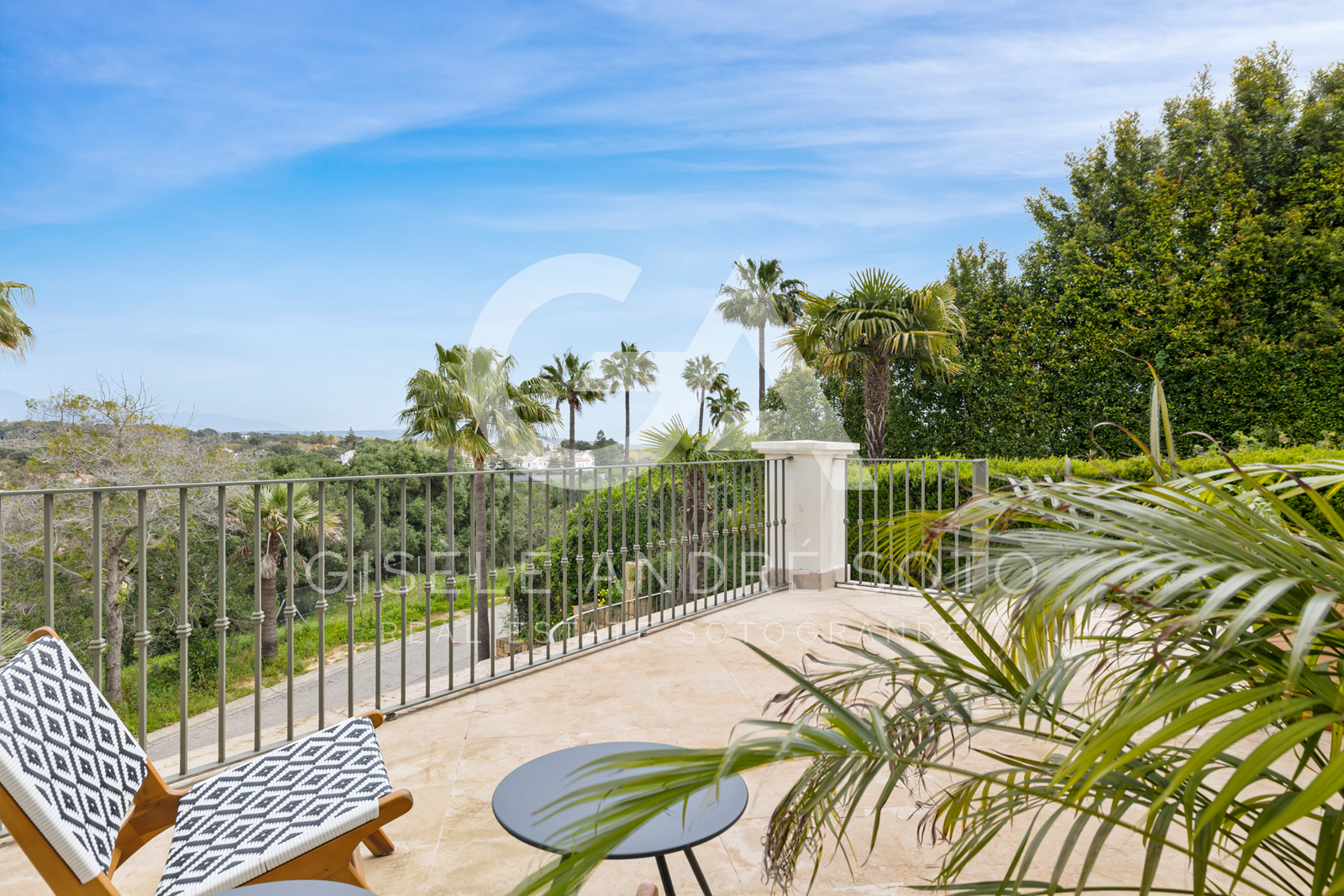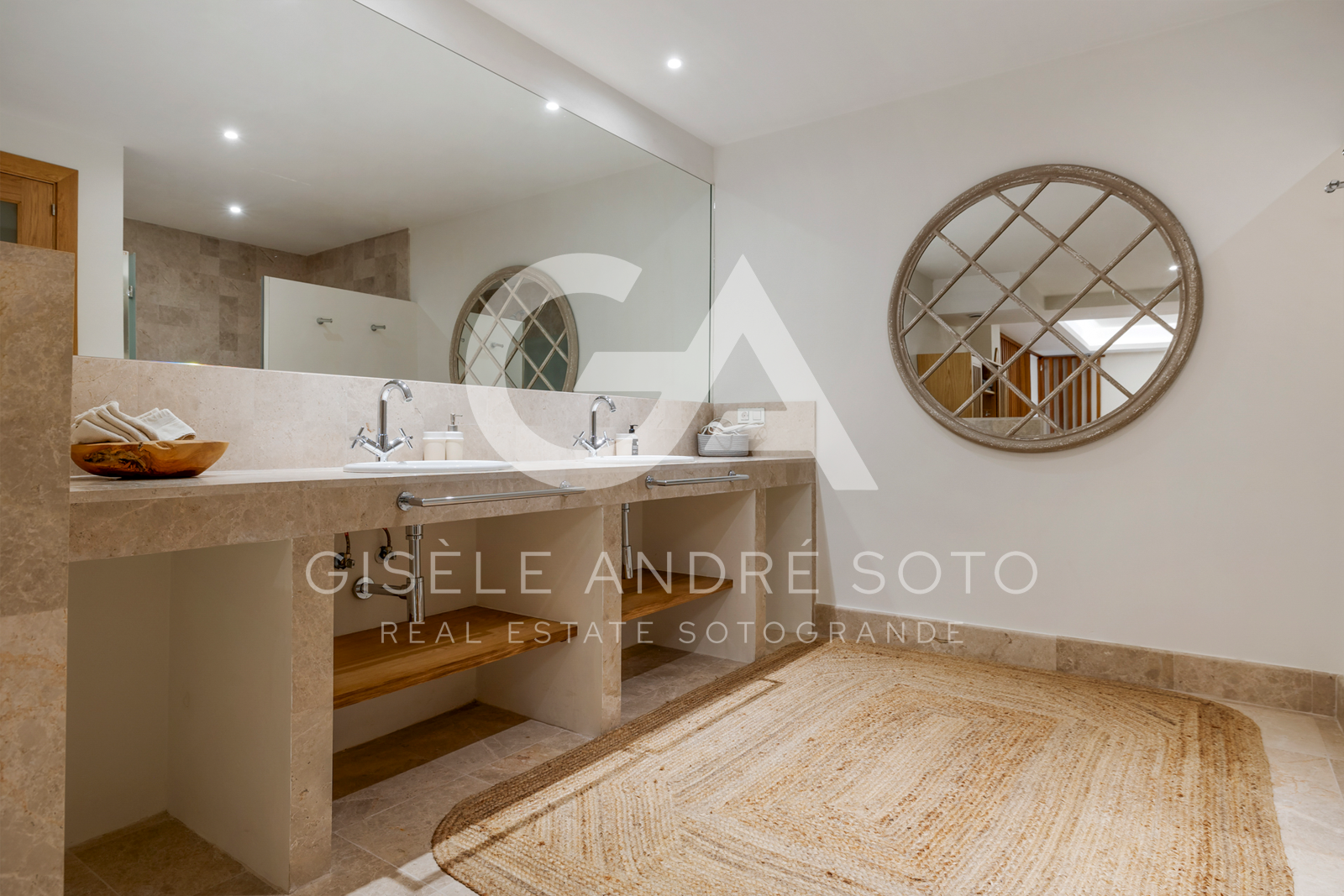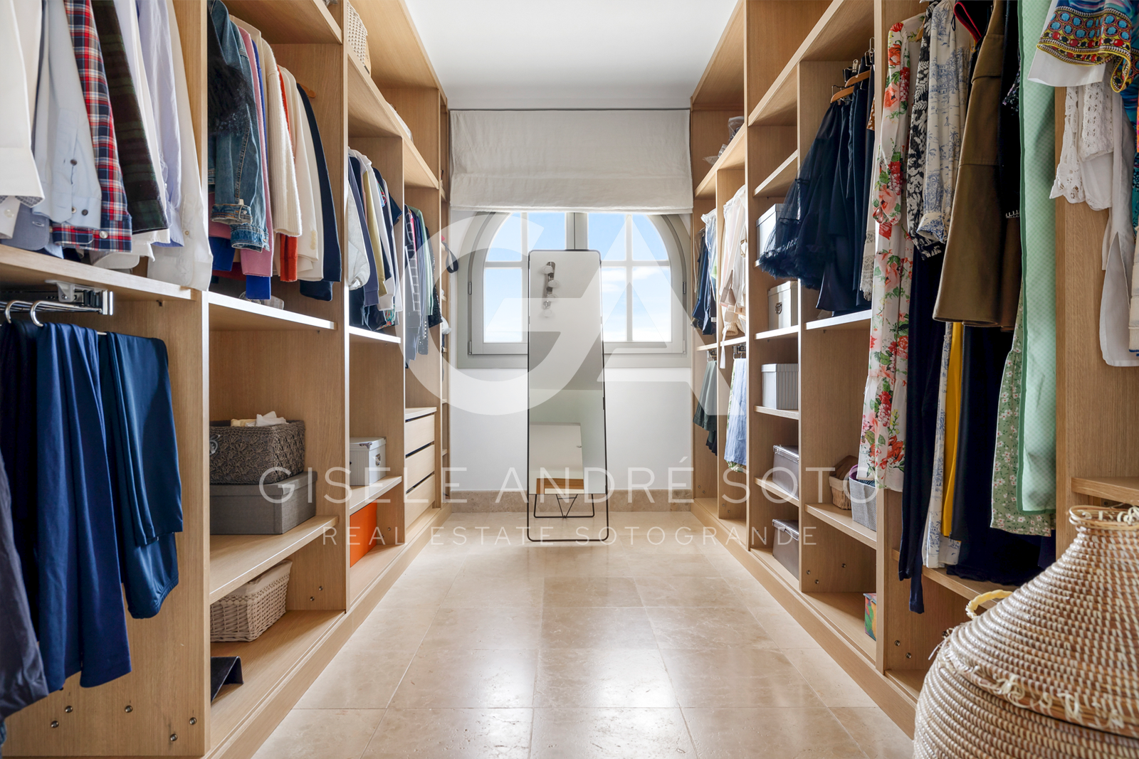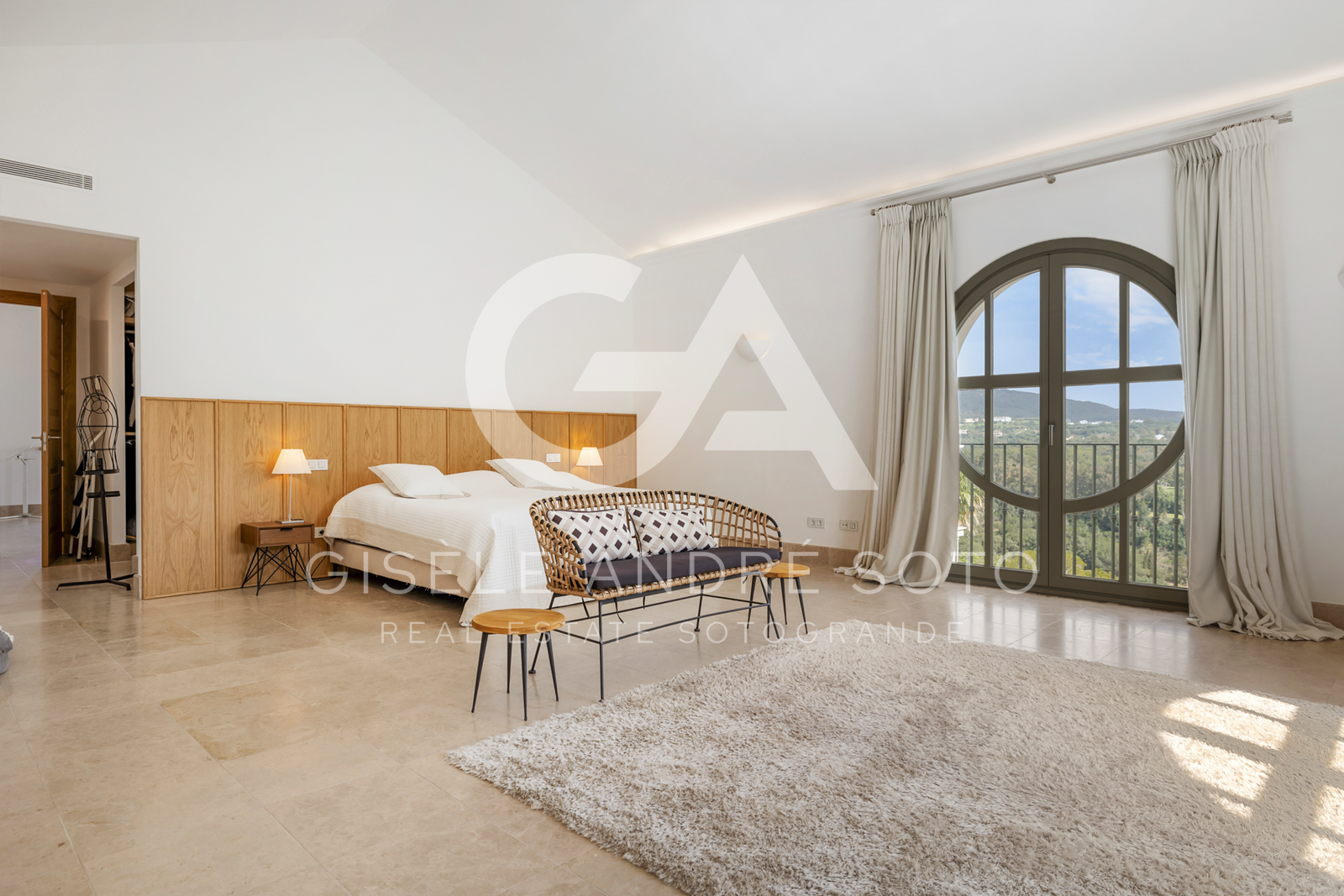 Ascending to the upper floor, the vast master suite of the villa in Zone F Sotogrande serves as a private sanctuary, complete with a terrace showcasing mesmerising views, an opulent en-suite bathroom, and a bespoke dressing room. Two additional bedrooms, each with en-suite bathrooms and private terraces, offer versatile spaces currently used as a guest room and a sophisticated office. Enhanced by underfloor heating, individually controlled air conditioning, and distinctive window architecture with graceful round arches, every room in the villa in Zone F Sotogrande is a gallery of distant horizons, tailored for family comfort and elegance.