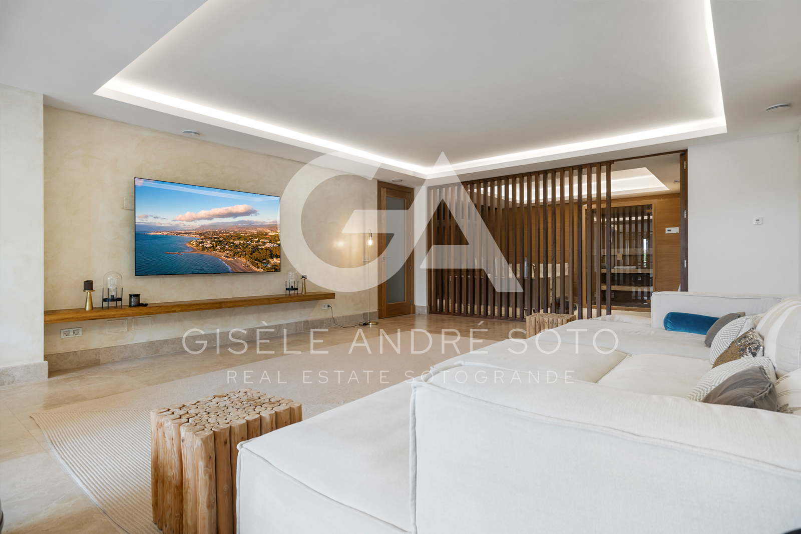 This villa in Zone F Sotogrande features a state-of-the-art kitchen, wellness basement with sauna, and panoramic golf and sea views, blending modern elegance with family comfort.