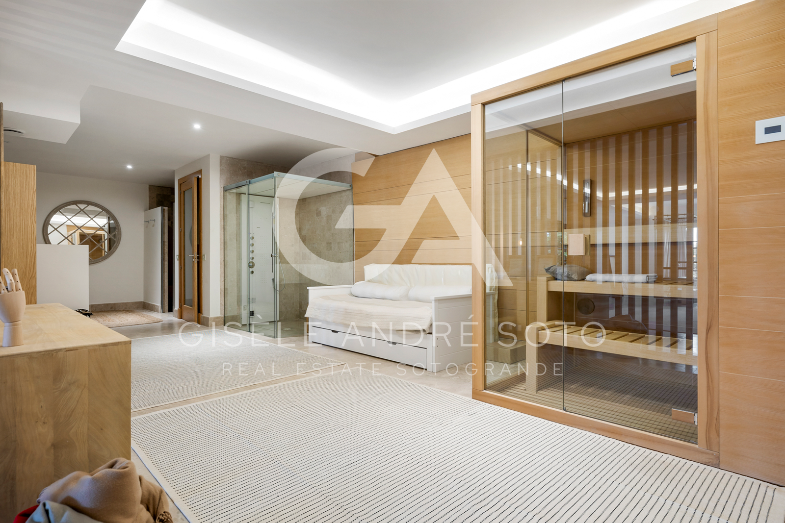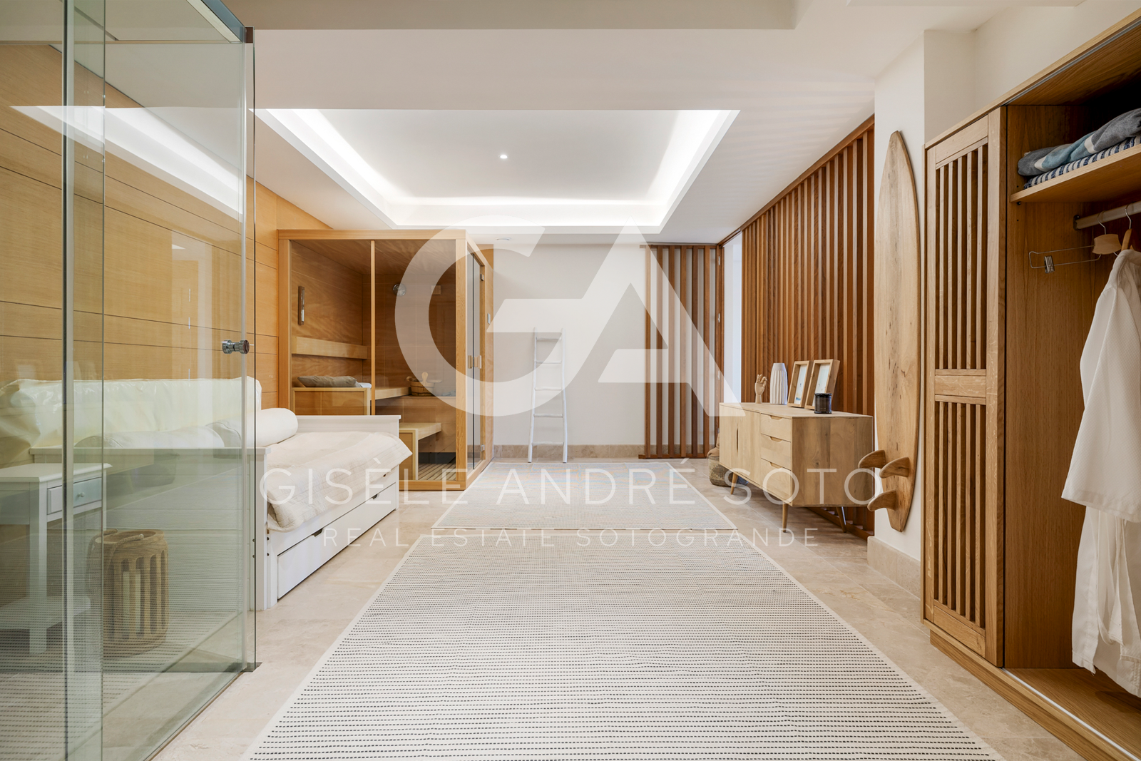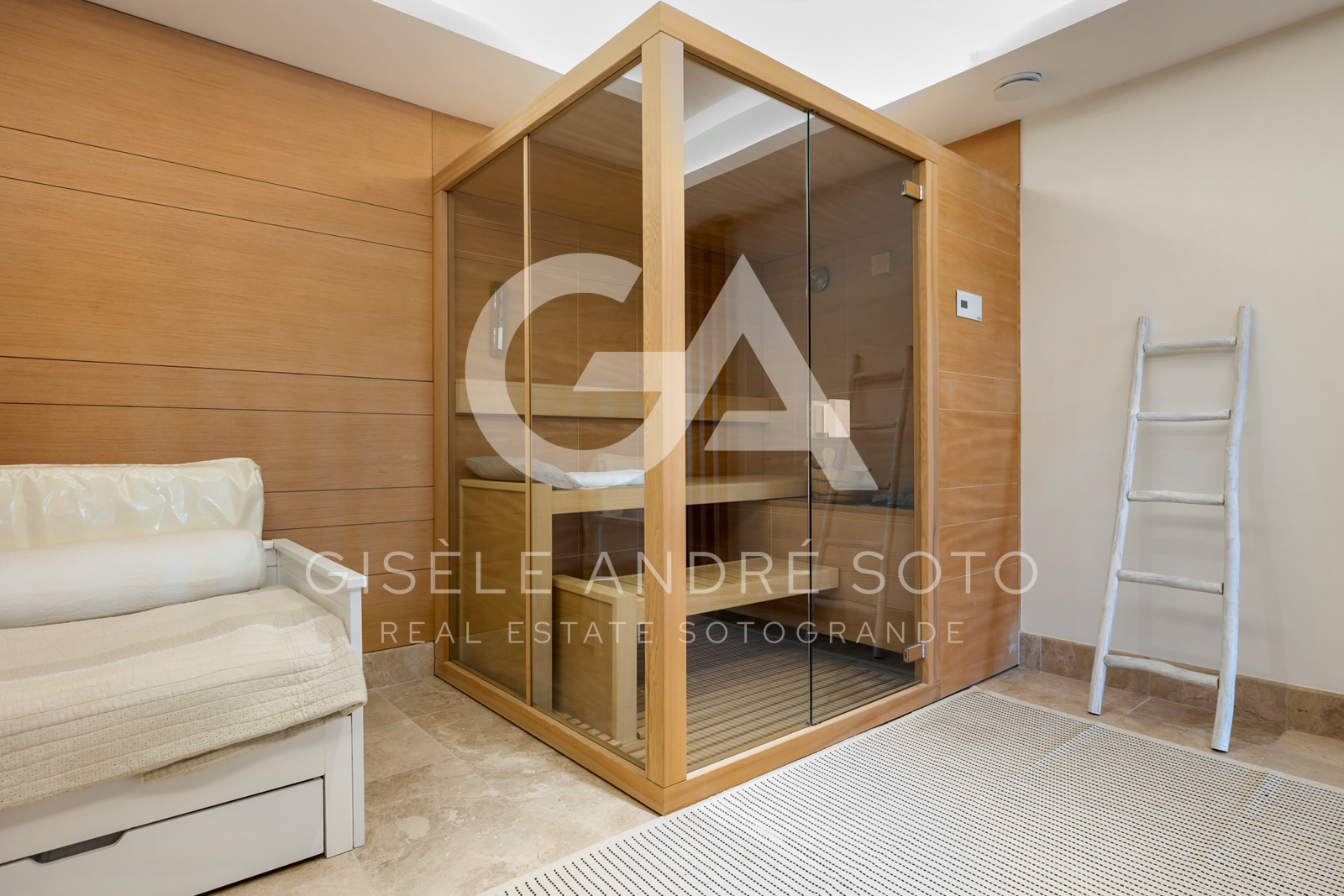 The basement of the villa in Zone F Sotogrande transforms into a wellness haven, featuring a sauna, modern showers, restful sleeping quarters, plush chill-out sofa nooks, and top-tier fitness equipment for an indulgent escape. Abundant built-in wardrobes maximise storage without compromising the villa’s sleek elegance. Outside, a south-facing garden envelops a pristine infinity pool, its natural beauty seamlessly extending the surrounding landscape. High-quality furnishings, some available for takeover, complement the villa’s impeccable craftsmanship, offering cutting-edge technology and exceptional value.