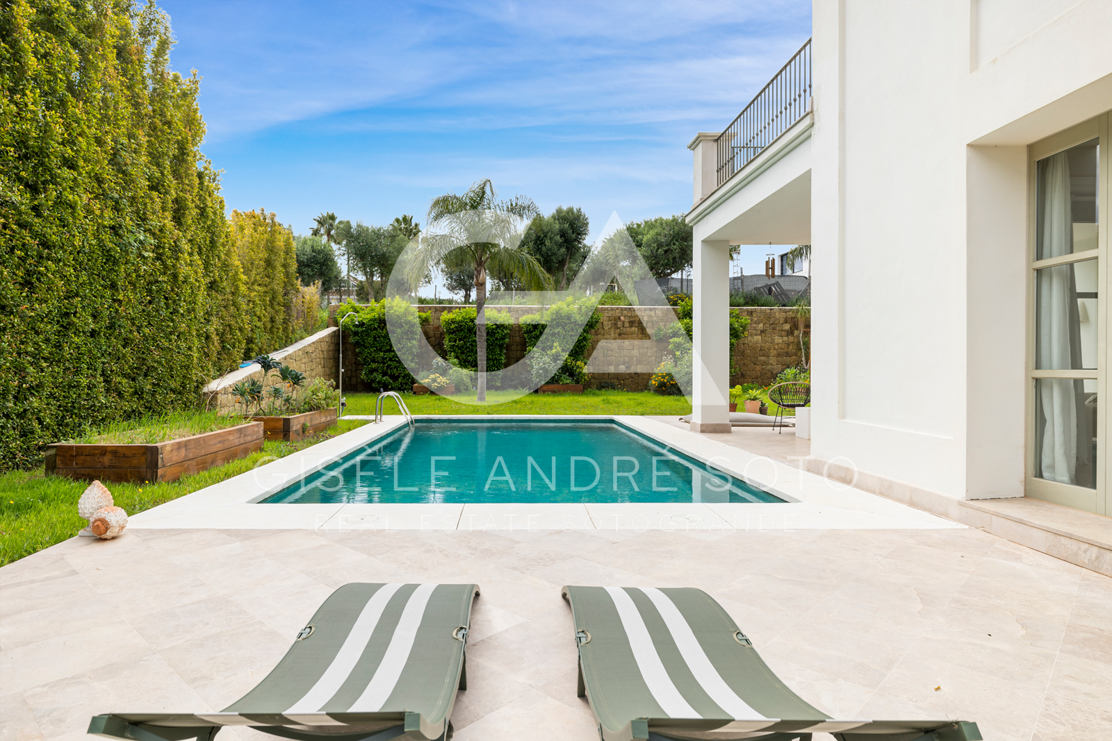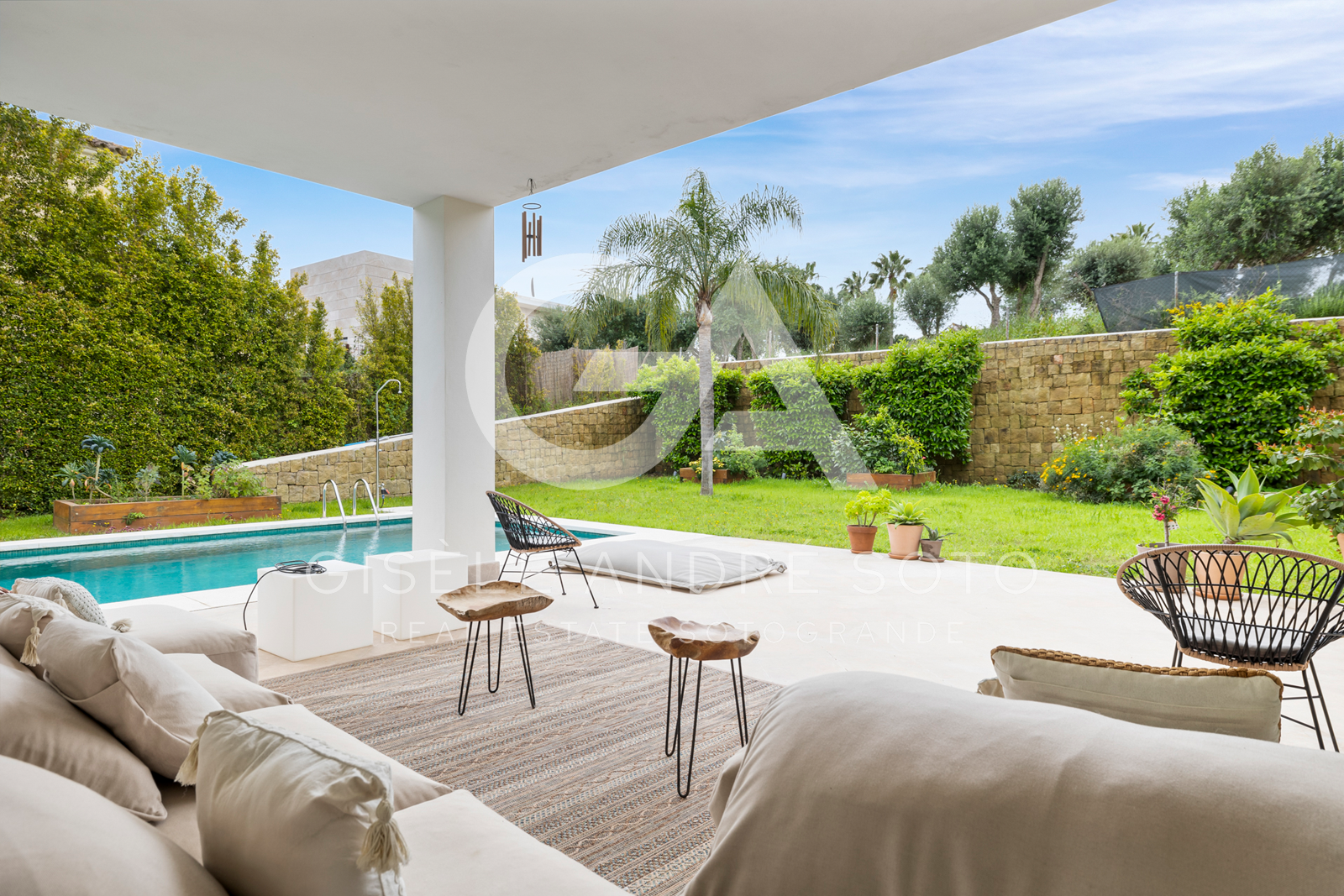 The villa in Zone F Sotogrande is near Valderrama Golf, Sotogrande Marina, and The Beach, with shops, restaurants, and beaches accessible by car or bicycle.